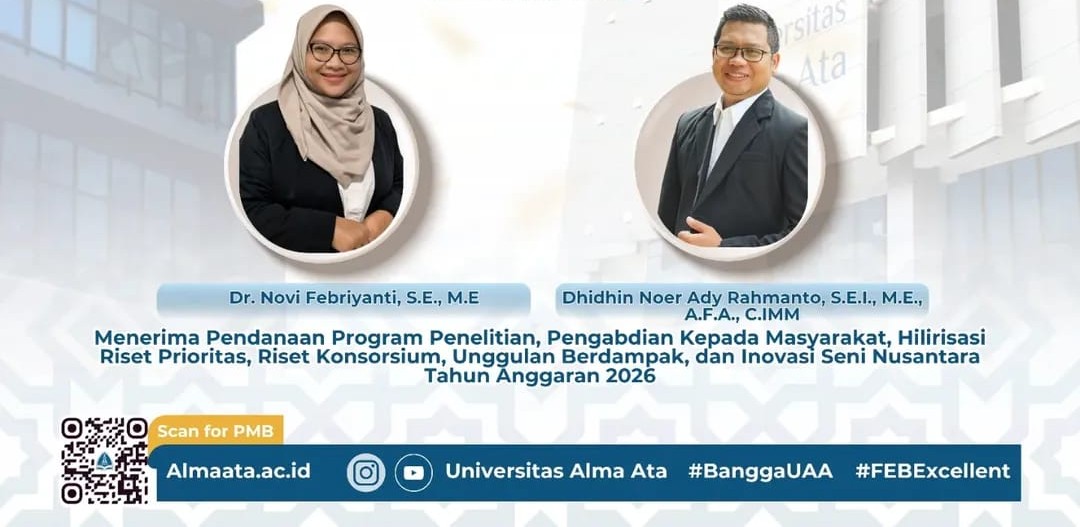 Perbankan Syariah- Universitas Alma Ata melalui Program Studi (Prodi) S1 Perbankan Syariah baru saja memperoleh kabar yang membanggakan dengan diterimanya dua usulan proposal penelitian dengan skema Fundamental Reguler dari Kemdiktisaintek 2026. Program hibah penelitian ini dilakukan secara kontinyu dan periodik oleh Kemdiktisaintek RI dengan tema yang dinamis dan filtrasi yang ketat untuk mendapatkan usulan riset maupun pengabdian yang diharapkan berdampak dengan cakupan yang luas. Sumbangan dua usulan riset dari Prodi S1 Perbankan Syariah di tahun 2026 disusun langsung oleh Ketua Program Studi (Kaprodi) yakni Ibu Dr. Novi Febriyanti, SE., ME dan Bapak Dhidhin Noer Ady Rahmanto, SEI., ME., AFA. Kedua dosen ini memiliki jam terbang yang relatif tinggi pada riset dan hibah, tidak hanya bersumber dari Kemdiktisaintek namun juga Kemenag RI.